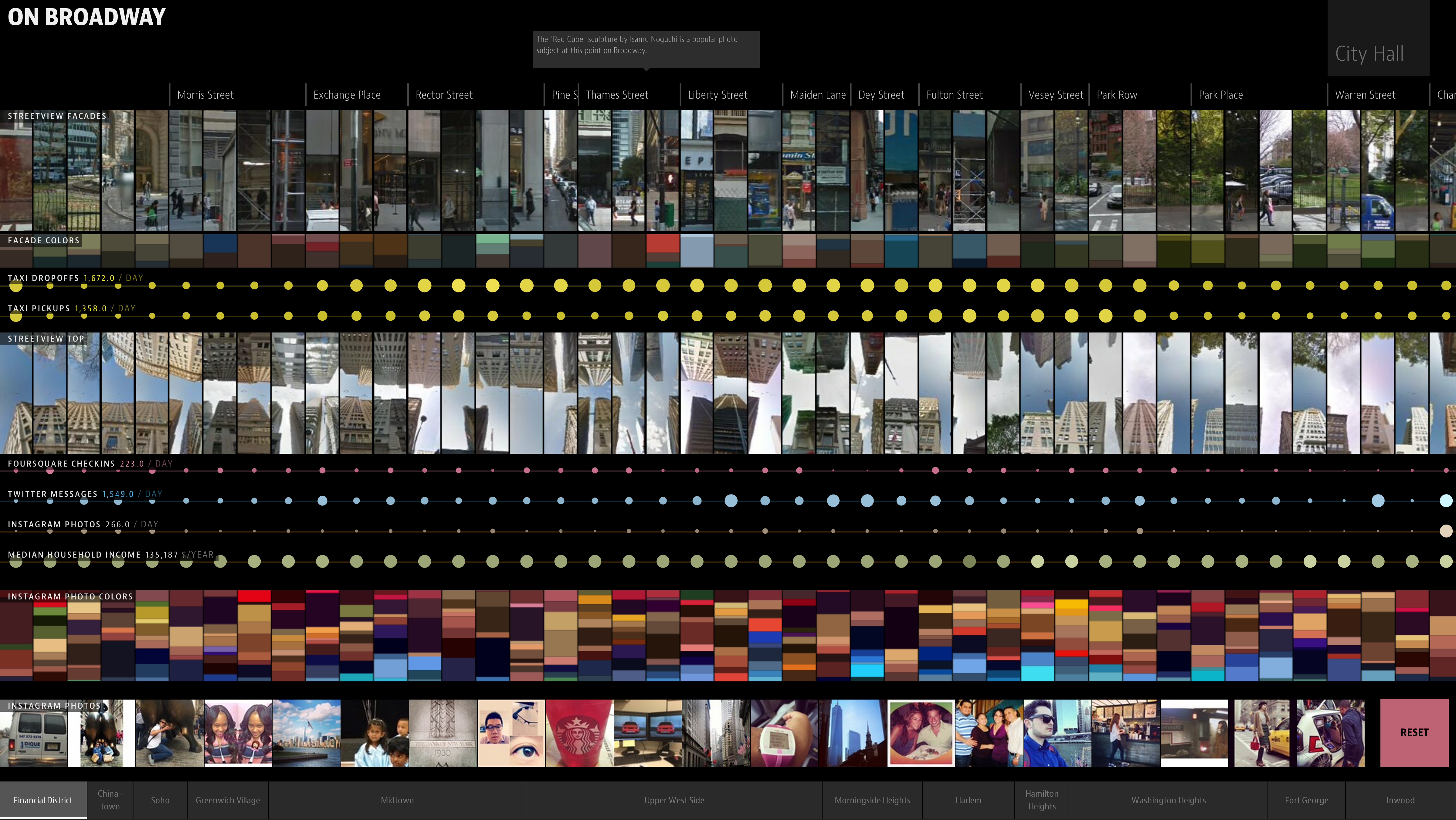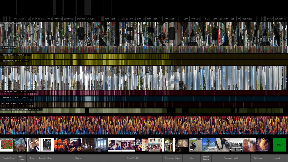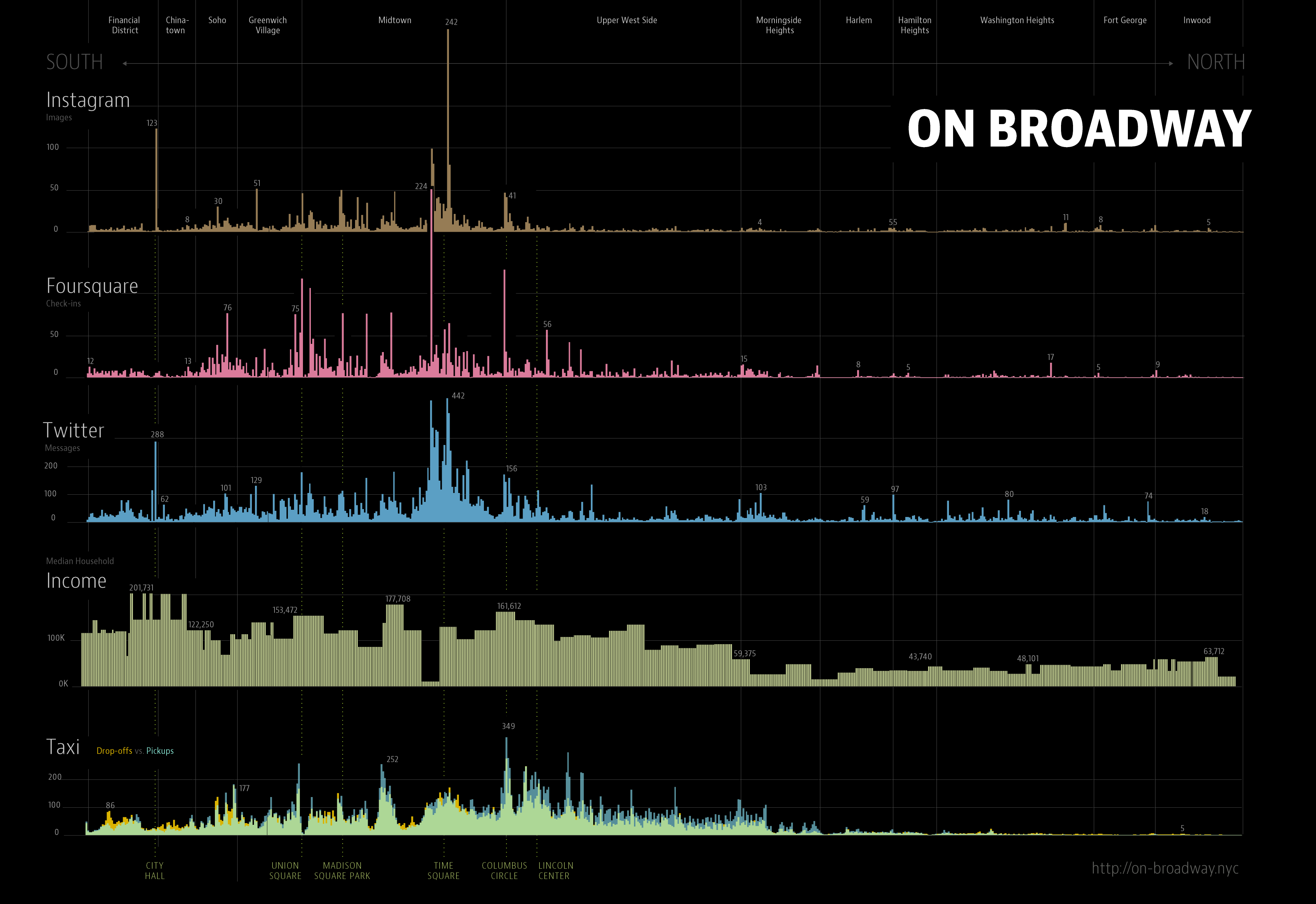 We also show average numbers of taxi pickups and drop-offs, Twitter posts with images, and average income for the parts of the city crossed by Broadway. To help with navigation, we added additional layers showing names of Manhattan neighborhoods crossed by Broadway, cross-streets and landmarks.