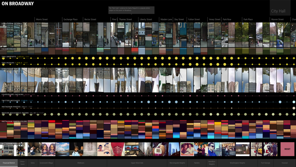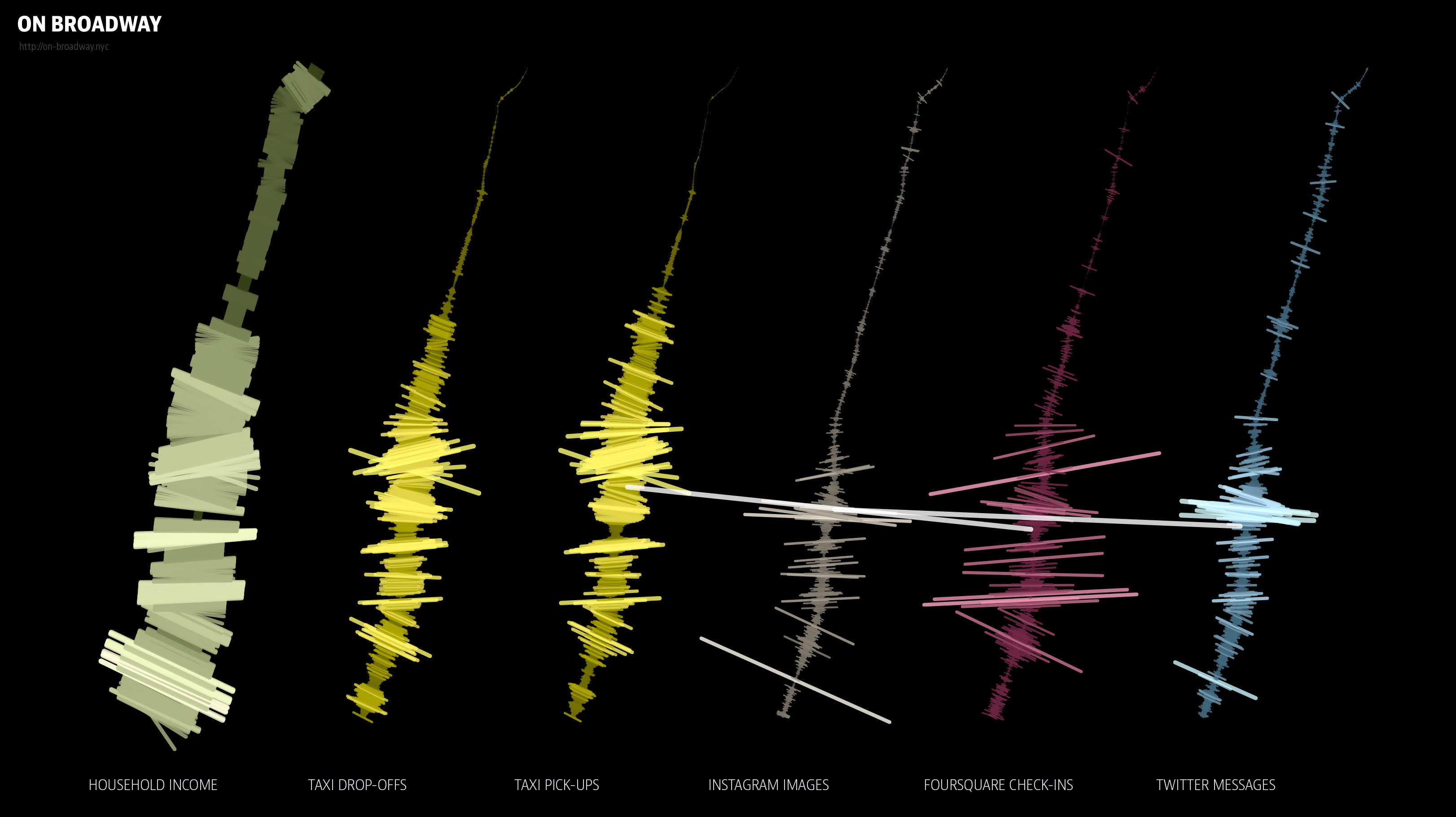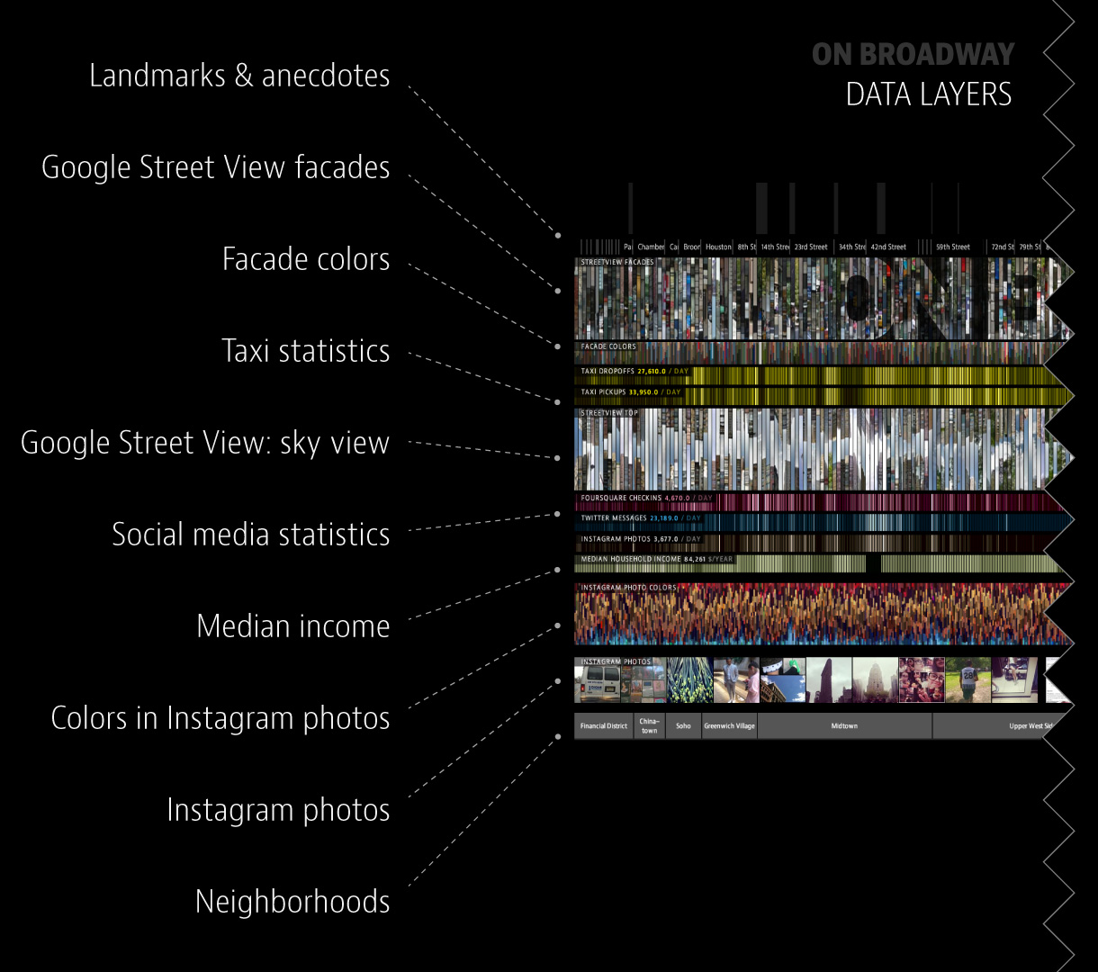 Image and data include 660,000 Instagram photos shared along Broadway during six months in 2014, Twitter posts with images, Foursquare check-ins since 2009, Google Street View images, 22 million taxi pickups and drop-offs in 2013, and economic indicators from US Census Bureau (2013).