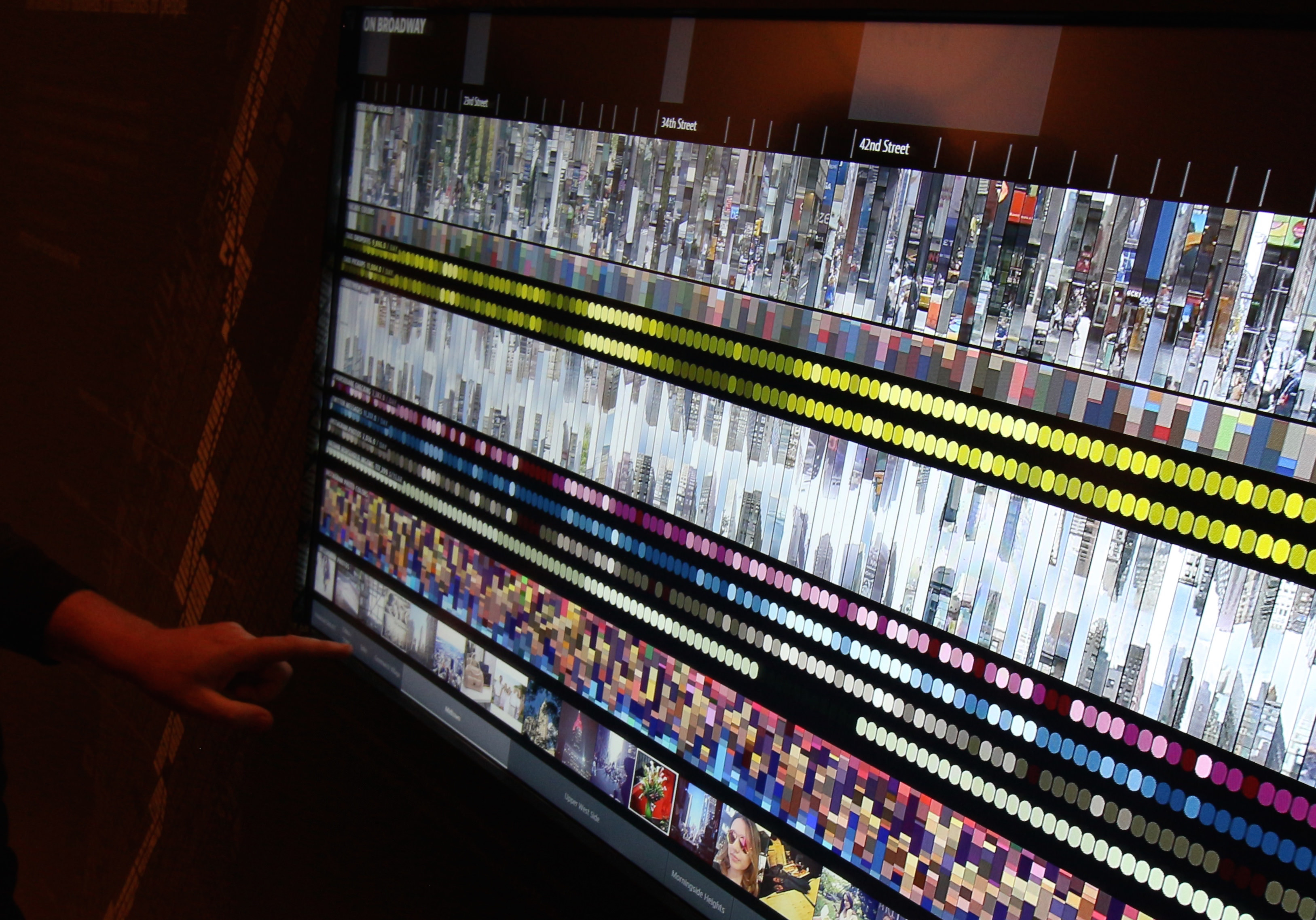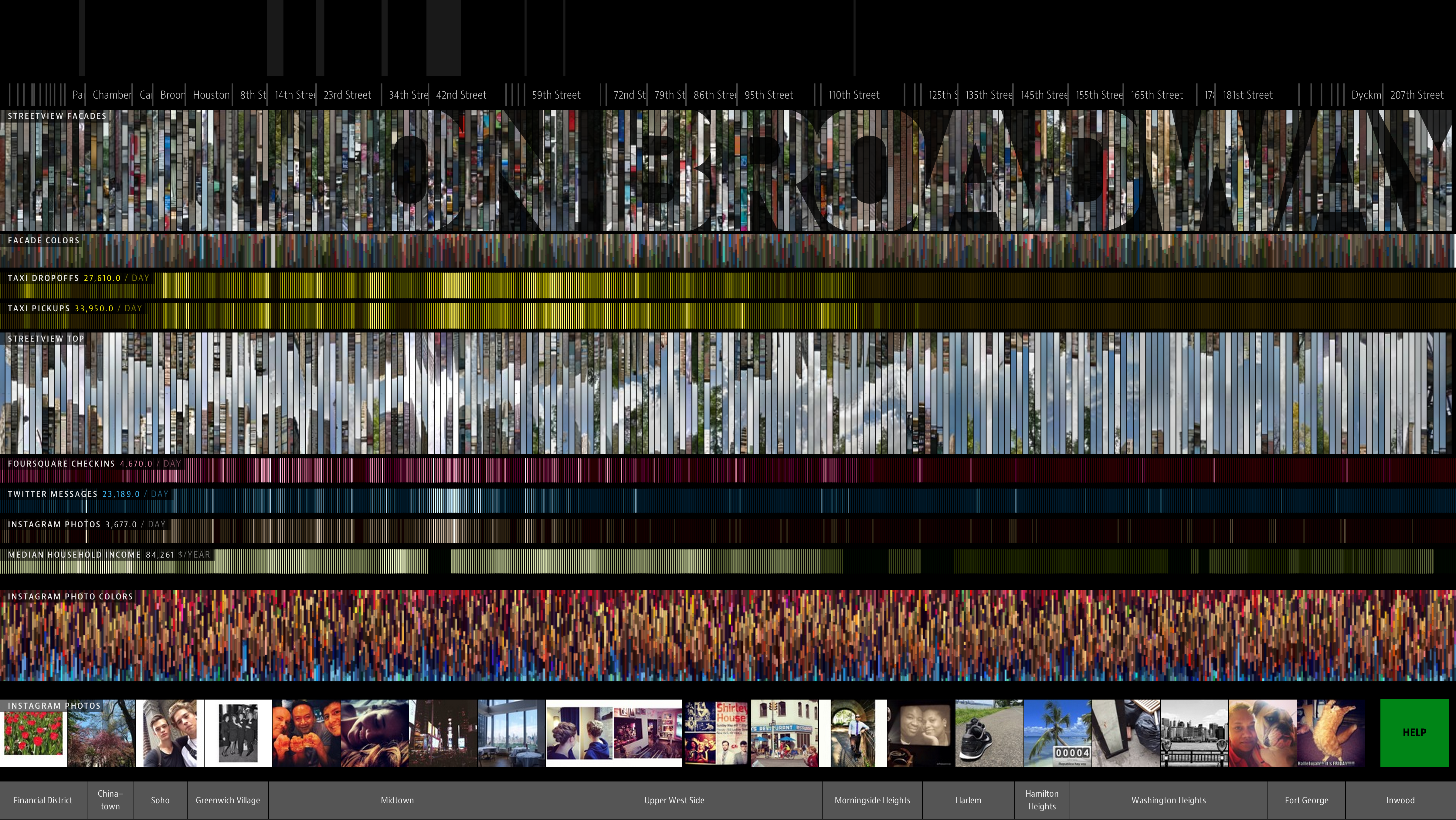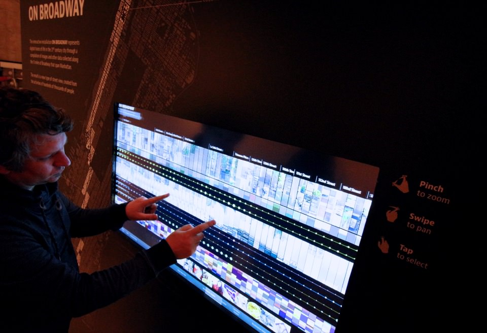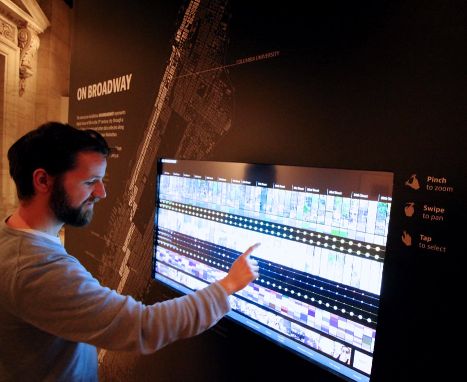 The interactive installation On Broadway represents life in the 21st century city through a compilation of images and data collected along the 13 miles of Broadway that span Manhattan.