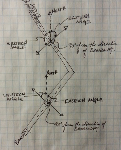 Like a spine in a human body, Broadway runs through the middle of Manhattan Island curving along its way. We wanted to include a slightly wider area than the street itself so we can capture also the activities nearby. To define this area, we selected points at 30 meter intervals going through the center of Broadway, and made 100 meter wide slices centered on every point. The result is a spine-like shape that is 21,390 meters (13,5 miles) long and 100 meters wide. We used the coordinates of this shape to filter the data we obtained for all of NYC, as described below.