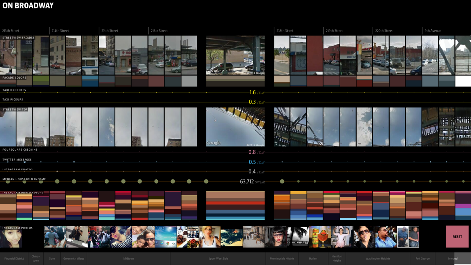 Instagram images and their data (locations, date and time, tags, and descriptions) were downloaded in Manovich’s lab in real time over 158 days in 2014. For Google Street View images, we were limited to the times Google photographed the Broadway. All other data sources are used to calculate averages per Broadway area, and therefore in some cases we used longer periods when such data was available.