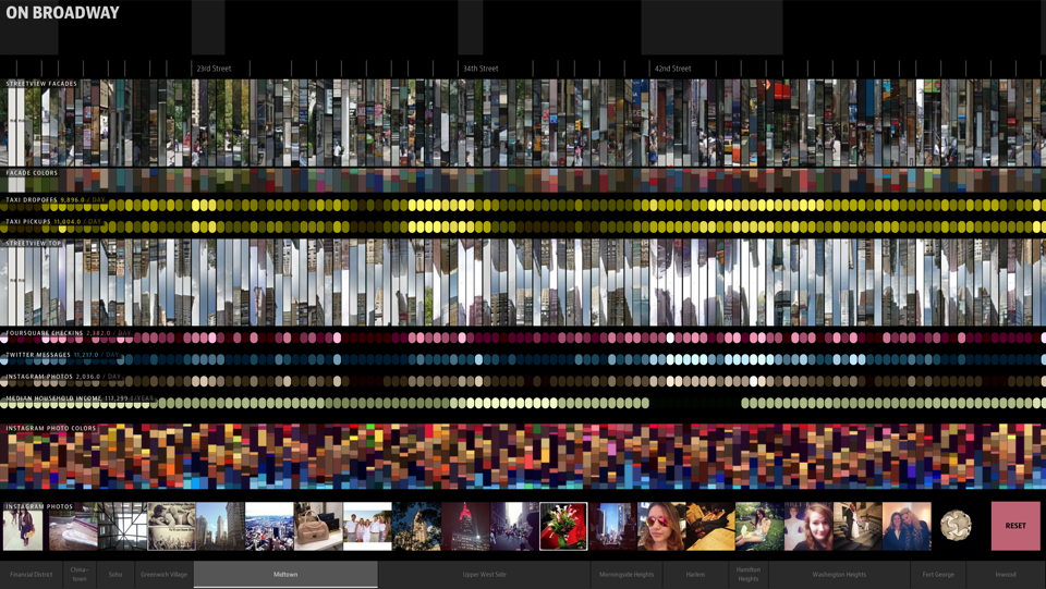 The result of our explorations is On Broadway: a visually rich image-centric interface, where numbers play only a secondary role, and no maps are used. The project proposes a new visual metaphor for thinking about the city: a vertical stack of image and data layers.